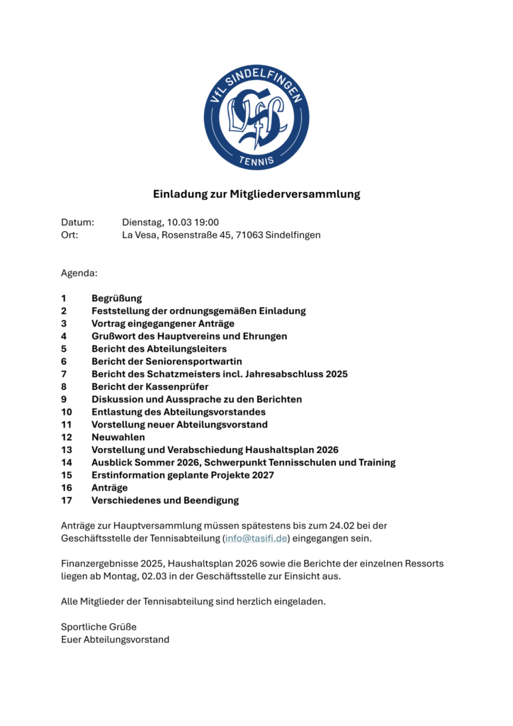 Im Anhang findet ihr die Agenda. Wir werden bis Ende nächster Woche nochmals separat informieren über Projekte, bzw. Projektgruppen, welche wir als Vorstand aus zeitlichen Gründen nicht leisten können, aber strategisch wichtig für die Tennisabteilung wären.